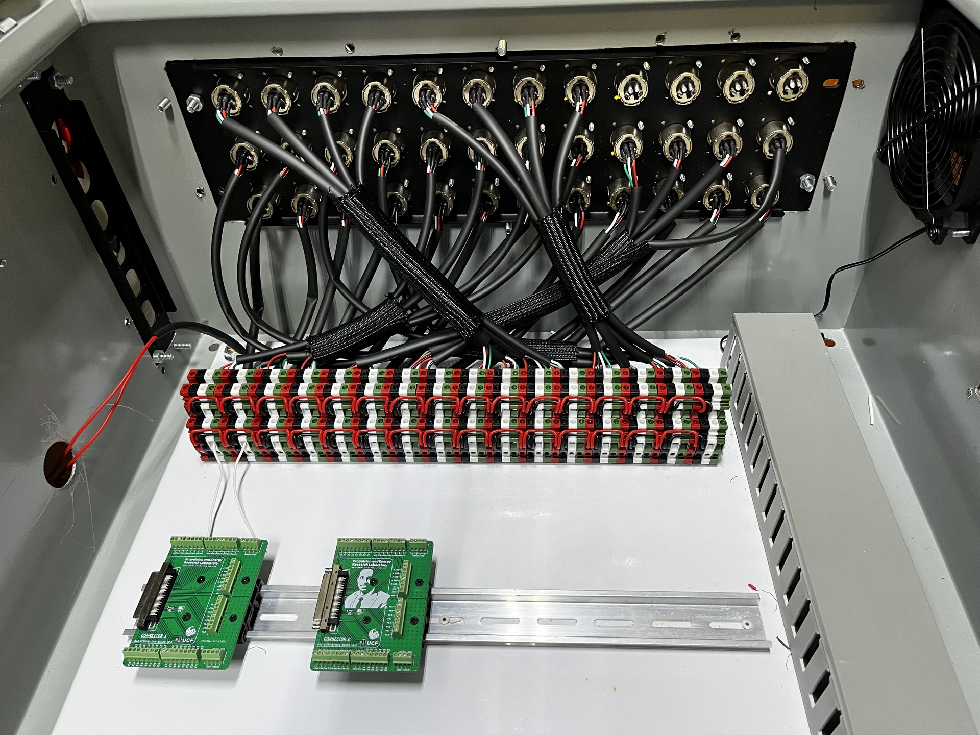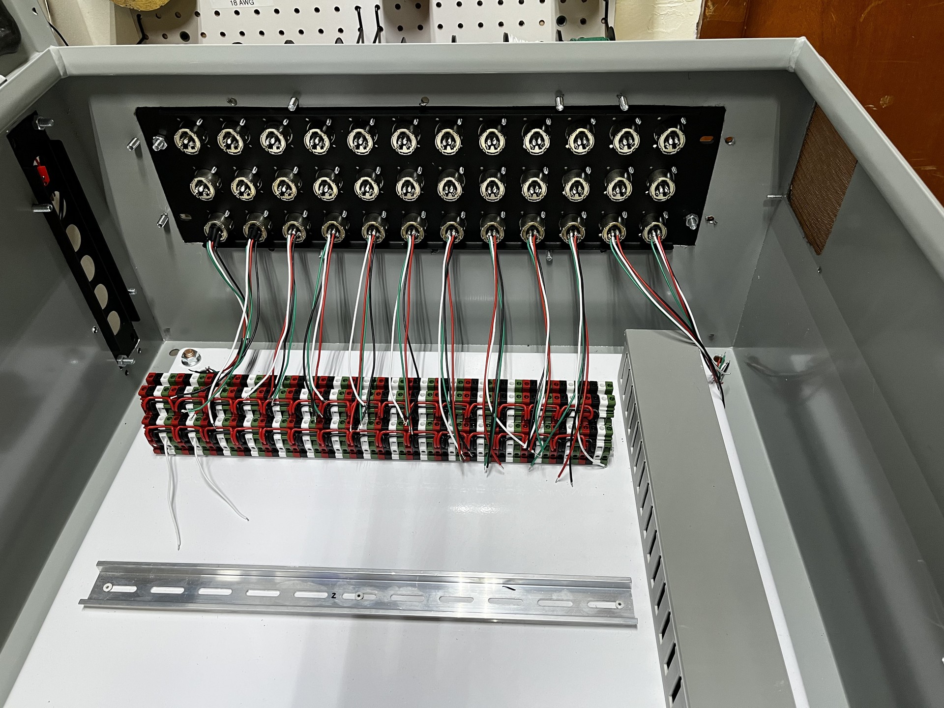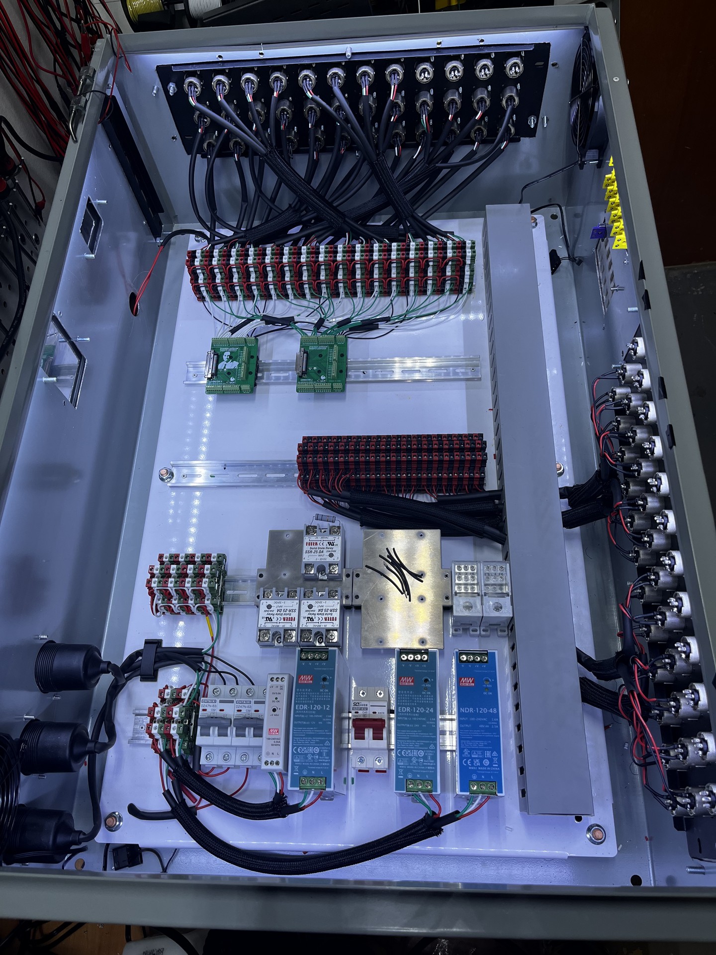 Got all of the power supplies in (5, 12, 24, 48 VDC for future capabilities), wired to independent breakers for safety cutoffs. Independent XLR panels for digital and analog signals, plus dedicated thermocouple ports (Type K & E). Got the first power on, no issues. LEDs provide nice, bright lighting to ease troubleshooting.