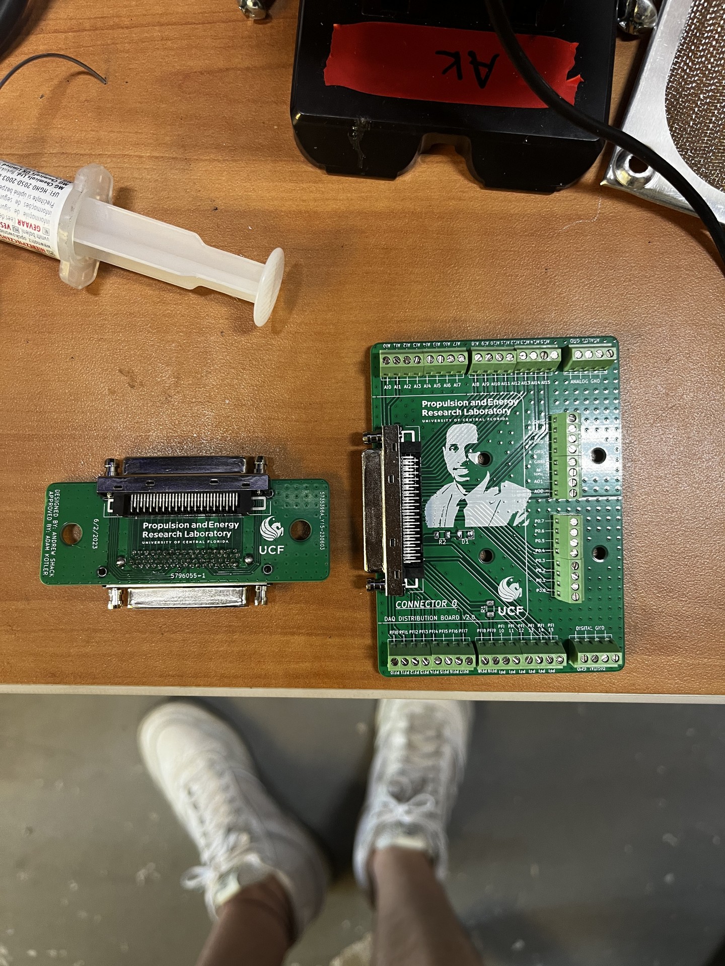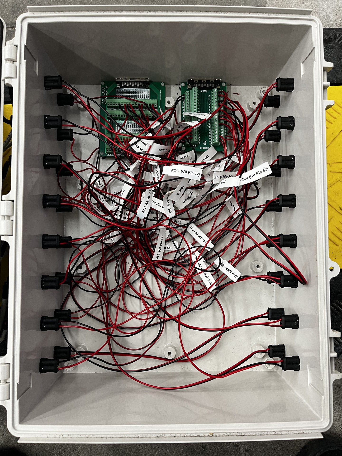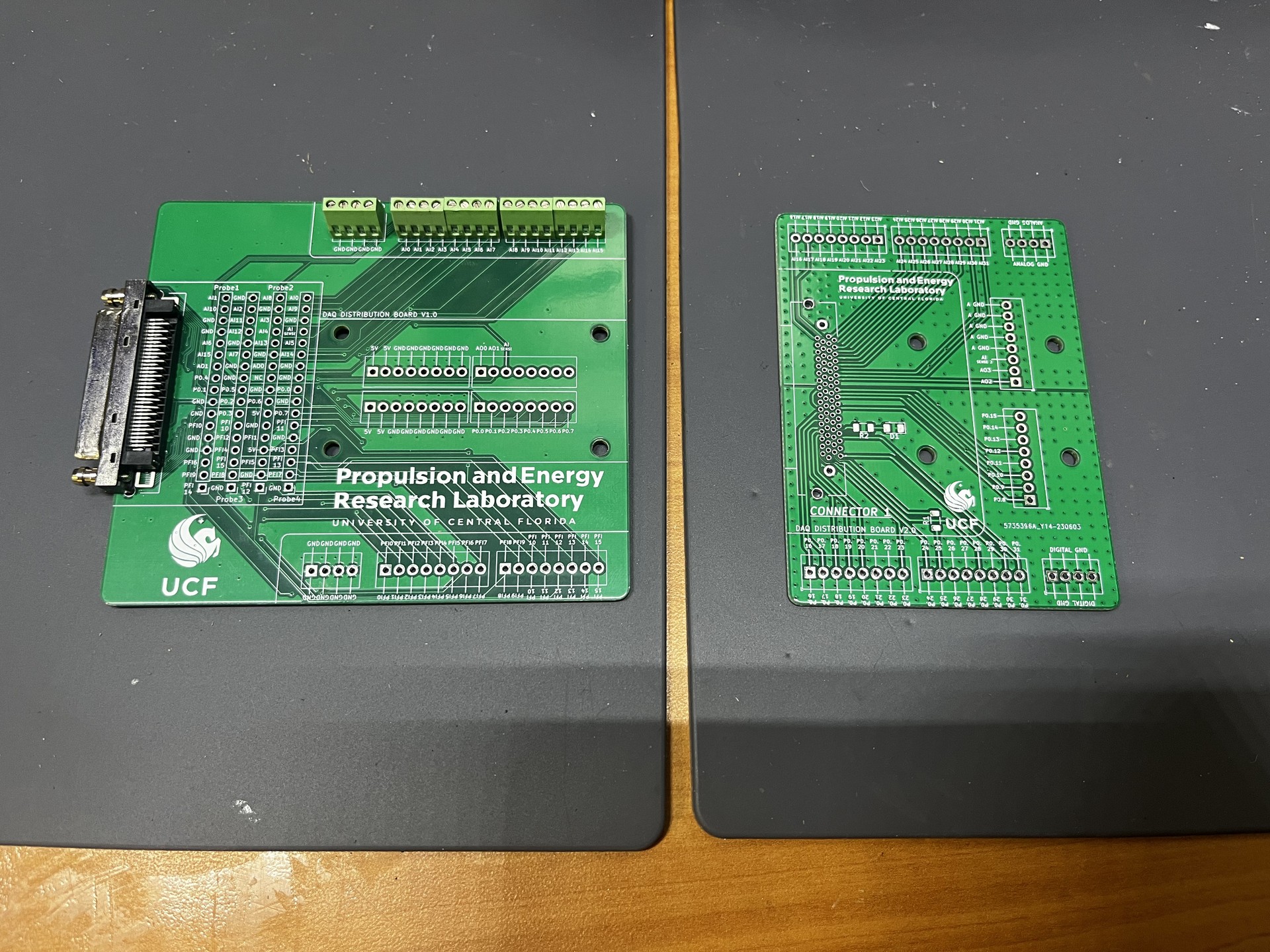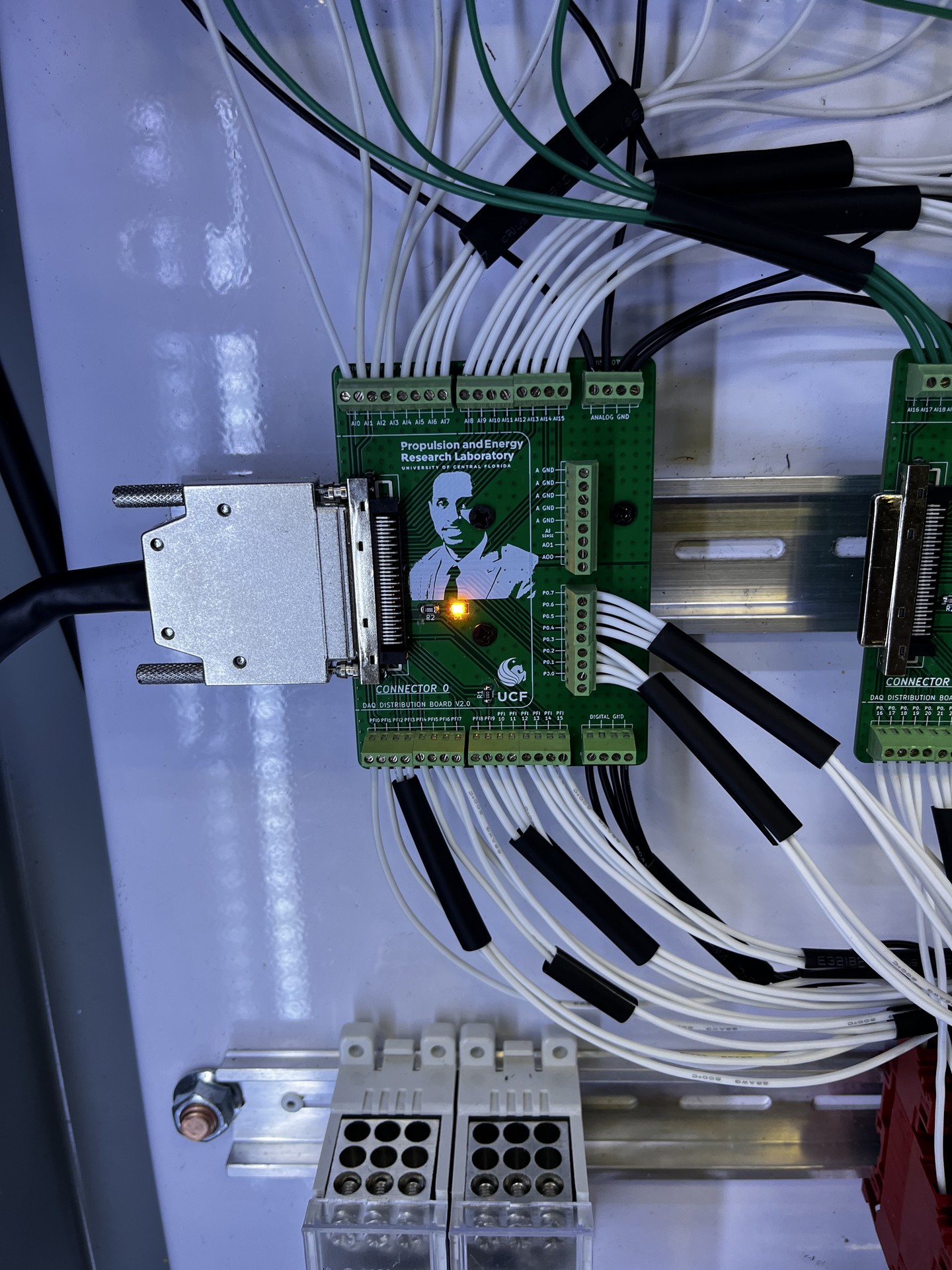 To ease cable management within the box, I designed a custom PCB to break out the DAQ's D-SUB connector to terminal blocks in an orientation conducive to wire management. The first photo shows version one on the left, and version 2 on the right.