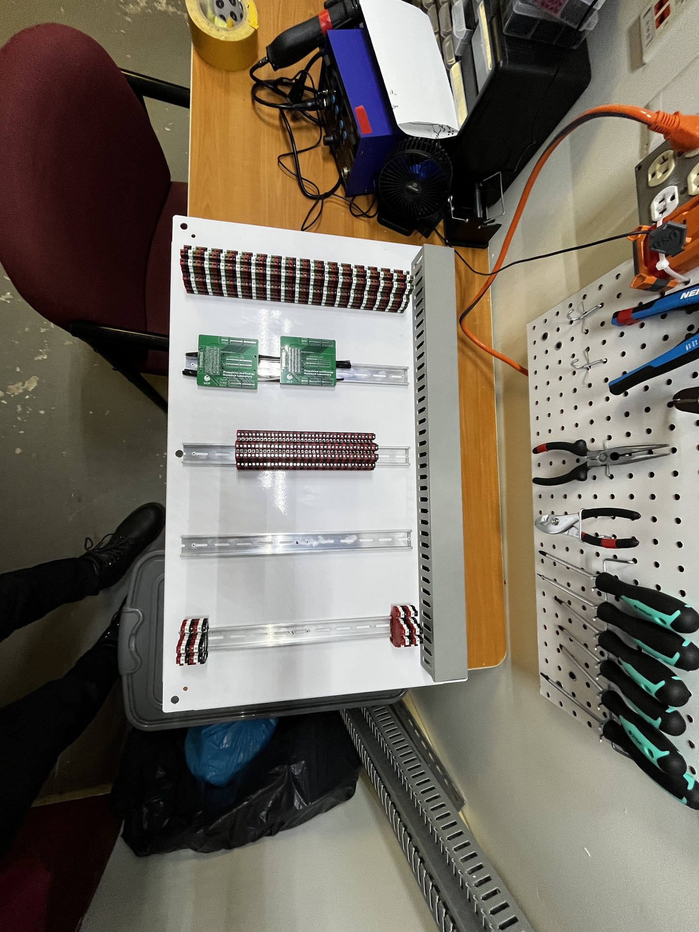 Rivet DIN Rail + cable tray onto the steel back panel of the waterproof enclosure. Began mounting components to the DIN rail.