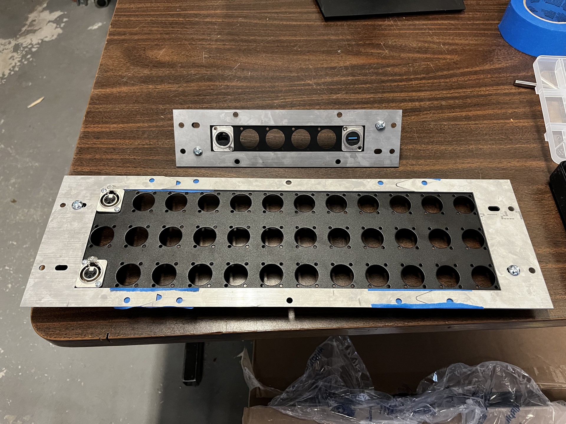 I got trained on a water jet I had access to at the time, and utilized this to cut the waterproof steel panels shown below. These mount the XLR mounting panel to the box.