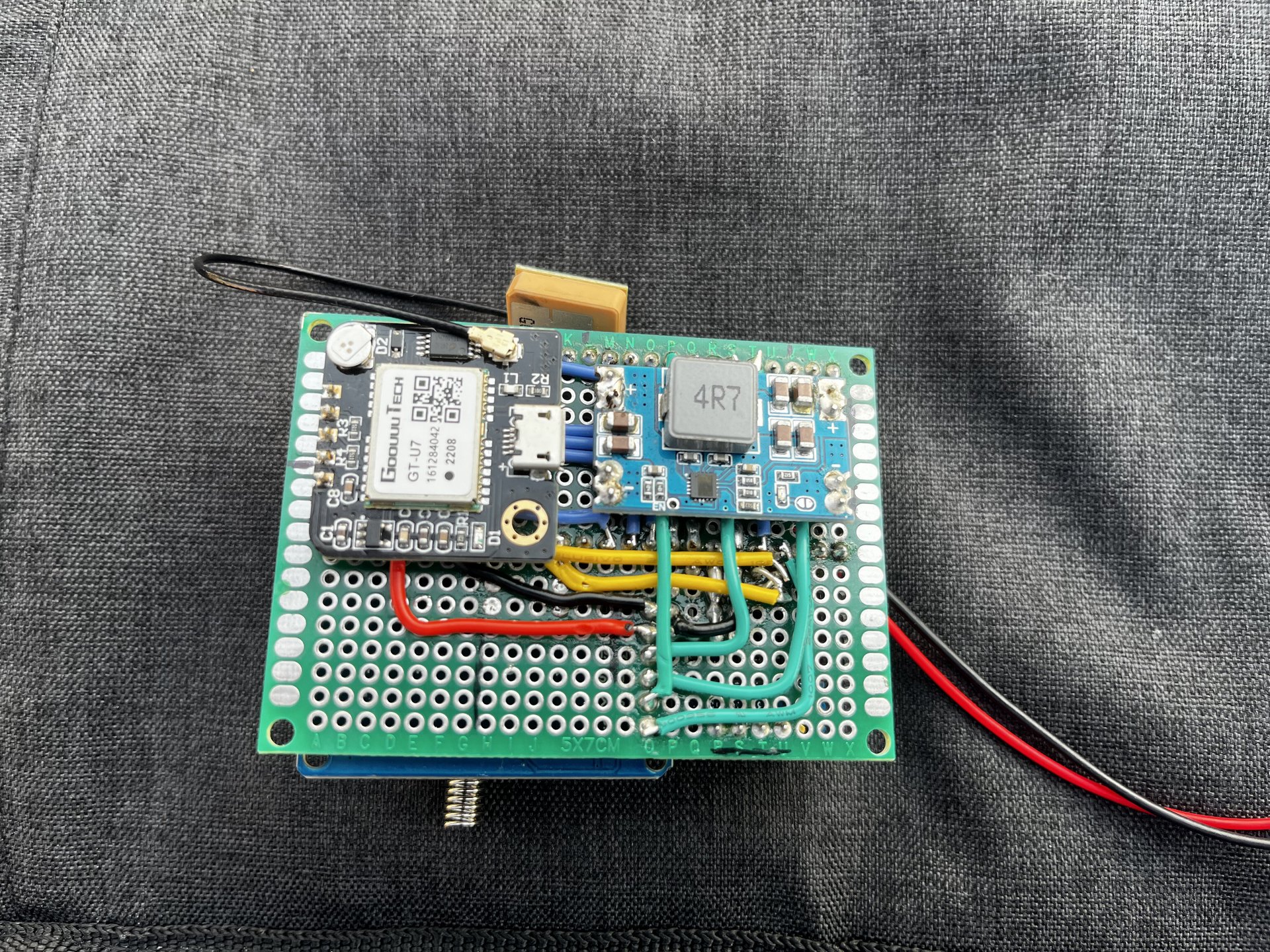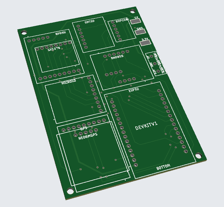 Fully assembled flight computer on a custom PCB. Ground station interconnect soldered on perf board.